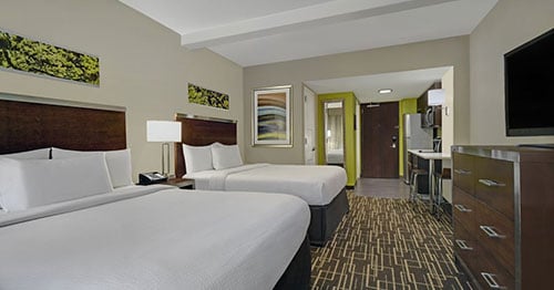 Amenities: Studios – kitchenettes; Suites offer fully-equipped kitchens; Free Wi-Fi, fitness center, housekeeping available, and laundry facilities