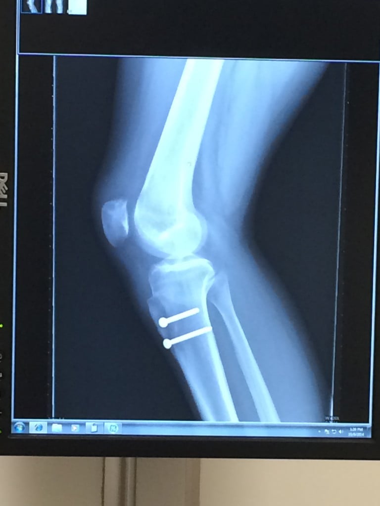 My knee pain was unbearable and the subluxations were becoming more common. I made an appointment to see Dr. Beth Shubin Stein to see what could be done with my knee. After a few appointments, X-rays, and MRIs, we decided to schedule surgery for August 21, 2014. Dr. Shubin Stein performed a TTT and MPFL. A TTT, also known as a tibial tubercle transfer or osteotomy, is a bone-cutting procedure. The top portion of the tibia bone is cut, repositioned, and put in place with two screws. An MPFL, or medial patellofemoral ligament repair, strengthens the medial ligament of the patella to better stabilize it. This was my first surgery and by far, one of the most terrifying experiences I have had.