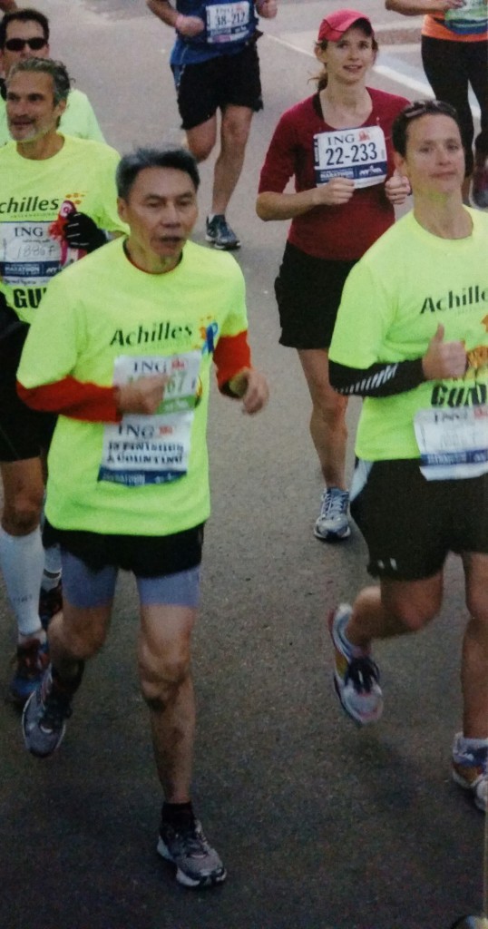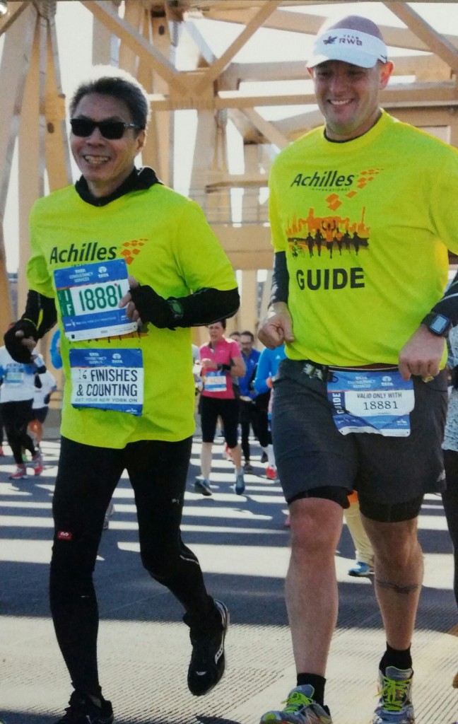 I’m not sure what drives me to do it. I suppose I just can’t help myself. I’m a “streaker”. I’m one of 113 people who have been awarded this title from the New York Road Runners by having an active streak of 15 or more consecutive NYC marathons. I presently have 17. I compete as a member of the Achilles Track Club, which is an organization whose goal is to create opportunities for disabled and able bodied athletes to participate together in main stream events such as the NYC Marathon. Due to a worksite accident in 1993 that crushed my left leg, I compete under the category of ambulatory disabled.