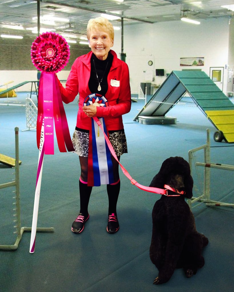 Seven years ago I had a partial knee replacement at HSS with Dr. Brian Nestor that took me out of road racing, but I got involved in the canine agility sport and now train and handle my two standard poodles, Maggie (8) and Mandy (3).