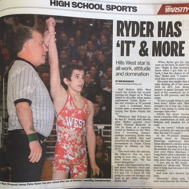 My name is Dylan Ryder and I tore my ACL in August 2014. I had surgery with Dr. Marx on November 2014. I am currently a high school varsity wrestler in 10 grade. I made a full come back and wrestled this year and won many titles- Easter State Champion, Leagues, Counties, and took 2nd place at the New York State Championship. I won 43 matches this year and was able to return to the sport I love because of Dr. Marx and his staff.