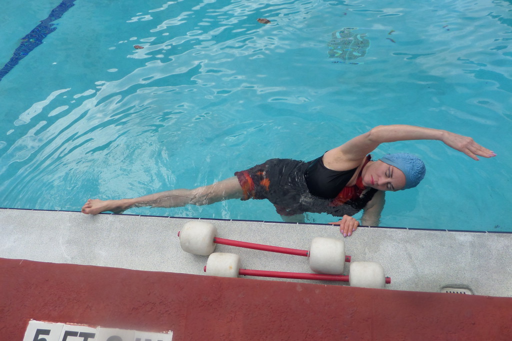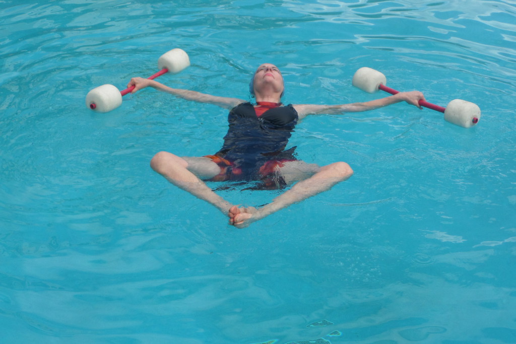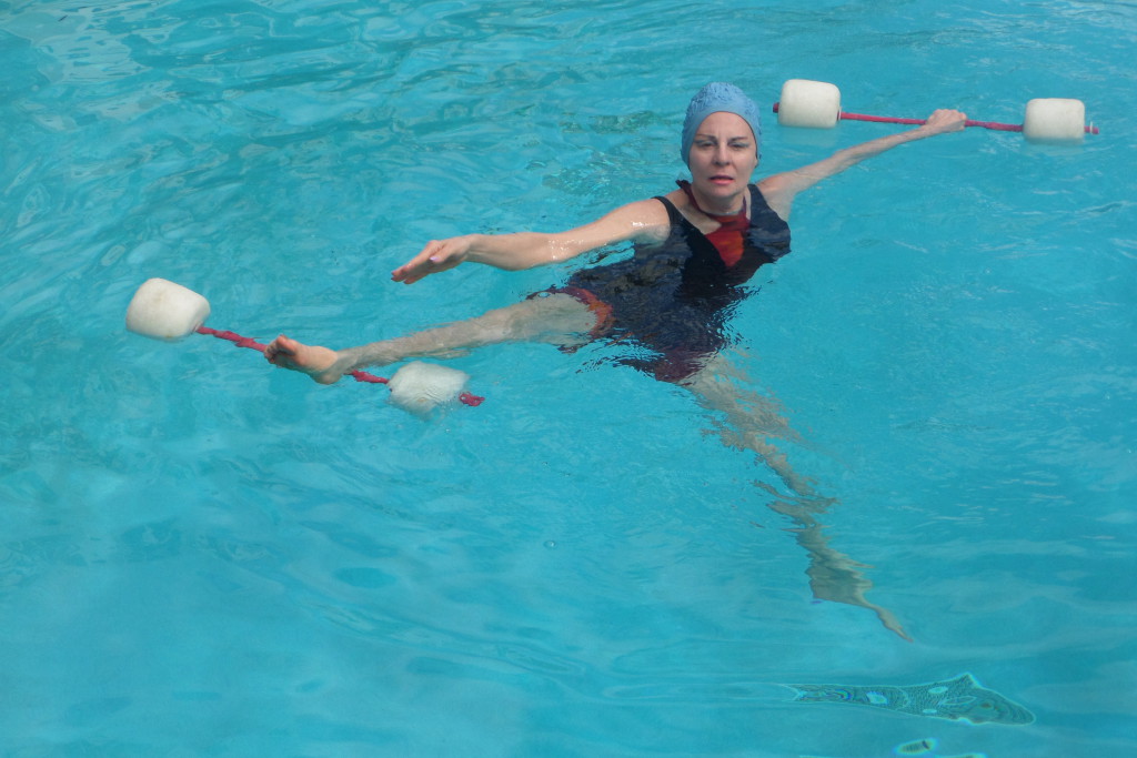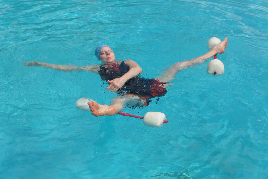 Each week new progress is experienced. Three months later I performed 2 duet dances and started my swimming exercise which I do indoors in winter and there are photos attached here 9 months later in an outdoor pool in Florida which show some of the exercises I made up with floating barbells. Going into deep water I do bicycle movements and stag leaps as well as "cross country ski" movements.