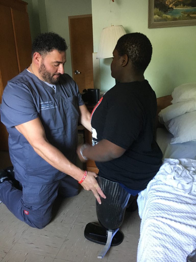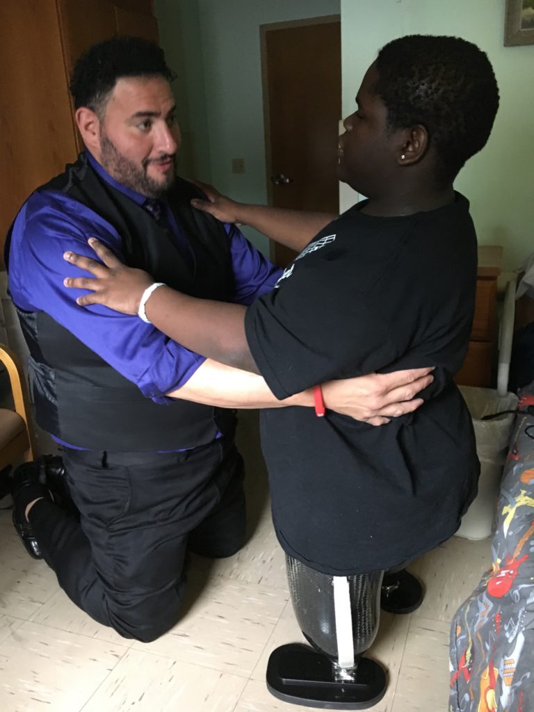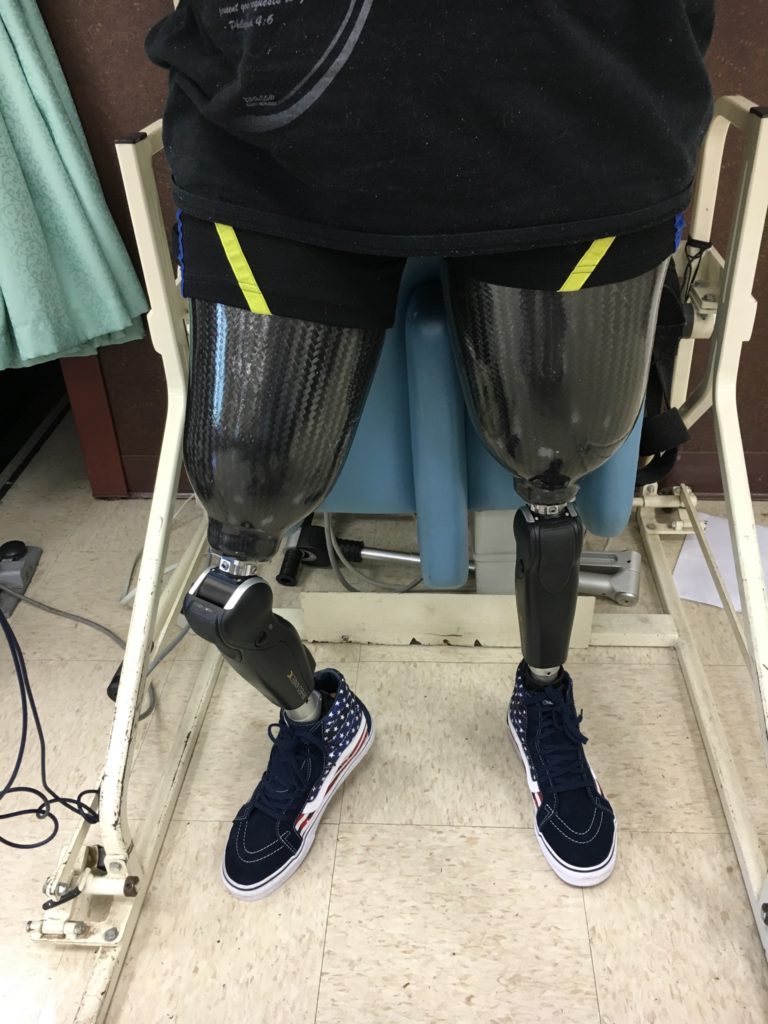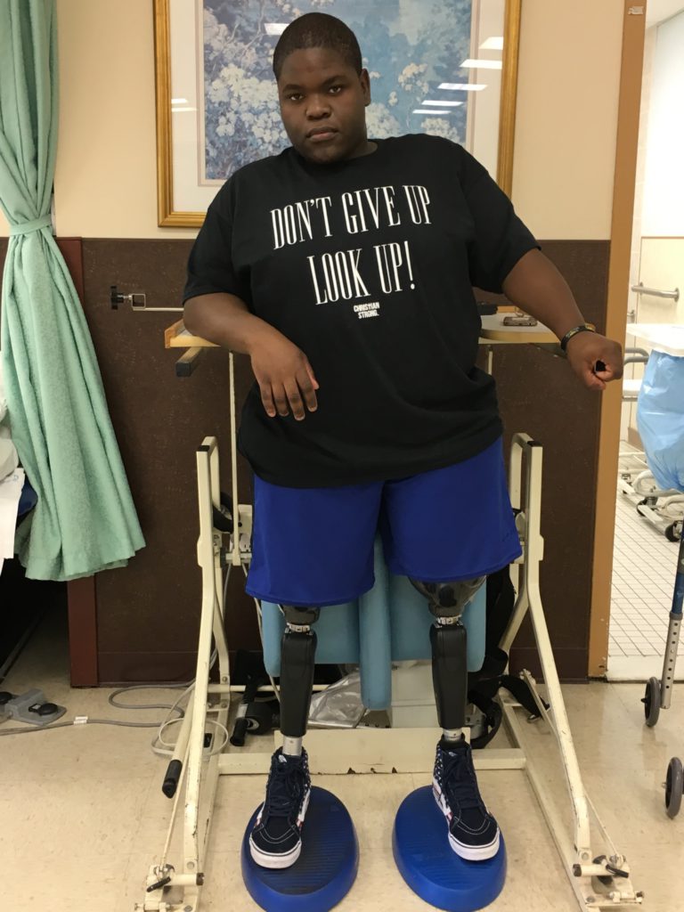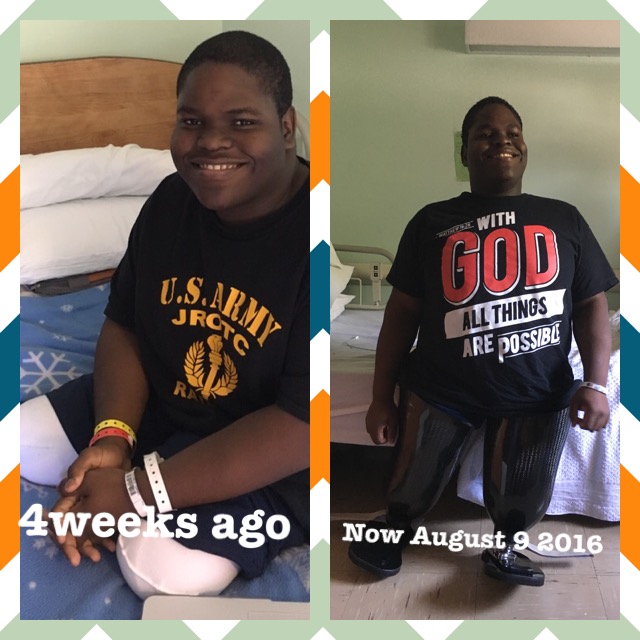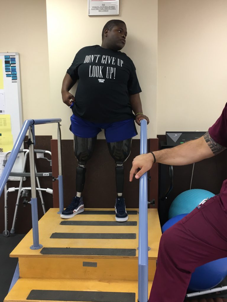 On July 19, I was transferred to a rehab facility where I receive between 4-6 hours of strength training and gait training seven days a week! I received my safety legs within a month and the first time I stood up in them everyone in the therapy room cried. Mom most of all. I was standing tall and proud and went from 4'5" tall to 5'7" tall in 3.5 seconds! and I started walking with a walker. One month after that I received my micro processor, bionic, self correcting RHEO-X knees. I now can go up and down stairs, walk around the gym three times and ride a recumbent bicycle. I also returned to school on September 26th. I Attend my four main courses from 8am until noon, and then go back to rehab where I will be for a few more months until I can walk safely with just a cane. I have maintained my honor roll status and still am a member of JROTC/Army.