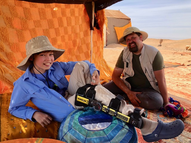 When I had a follow up visit with Dr. Fabricant, my knee was in great shape, but he worried about the inherent risks involved in any international travel, let alone the Sahara Desert. Reassured that I would have wheelchair service at the airports, and access to a 4x4 in the desert, and the desert’s surface itself is flat and gravelly hard, he cleared me to go. And no camel rides he advised and joked I may be at greater risk at my all boys’ school.