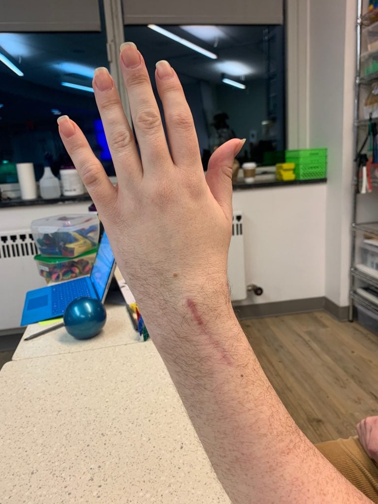 In the recovery room after surgery, Dr. Daluiski said that everything went well, even though it was a very severe accident. He inserted multiple plates and screws to help set my wrist (see photo 4). It was pretty painful for 2-3 days after surgery, but after that my wrist began to feel progressively better. I saw Dr. Daluiski about one week after the surgery and he said everything looked great so far (see photo 5 and 6). I was amazed that my wrist began to look like a normal wrist and that I was able to begin performing gentle range of motion exercises with the occupational therapists at the hospital. About six weeks after the surgery, I had a second surgery to remove some of the hardware in my wrist. The second surgery also went very smoothly. Throughout this process, I continued working with the occupational therapists to regain the motion and strength in my wrist.