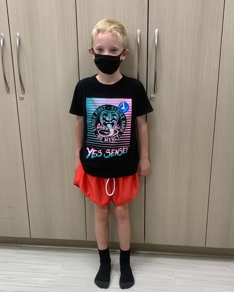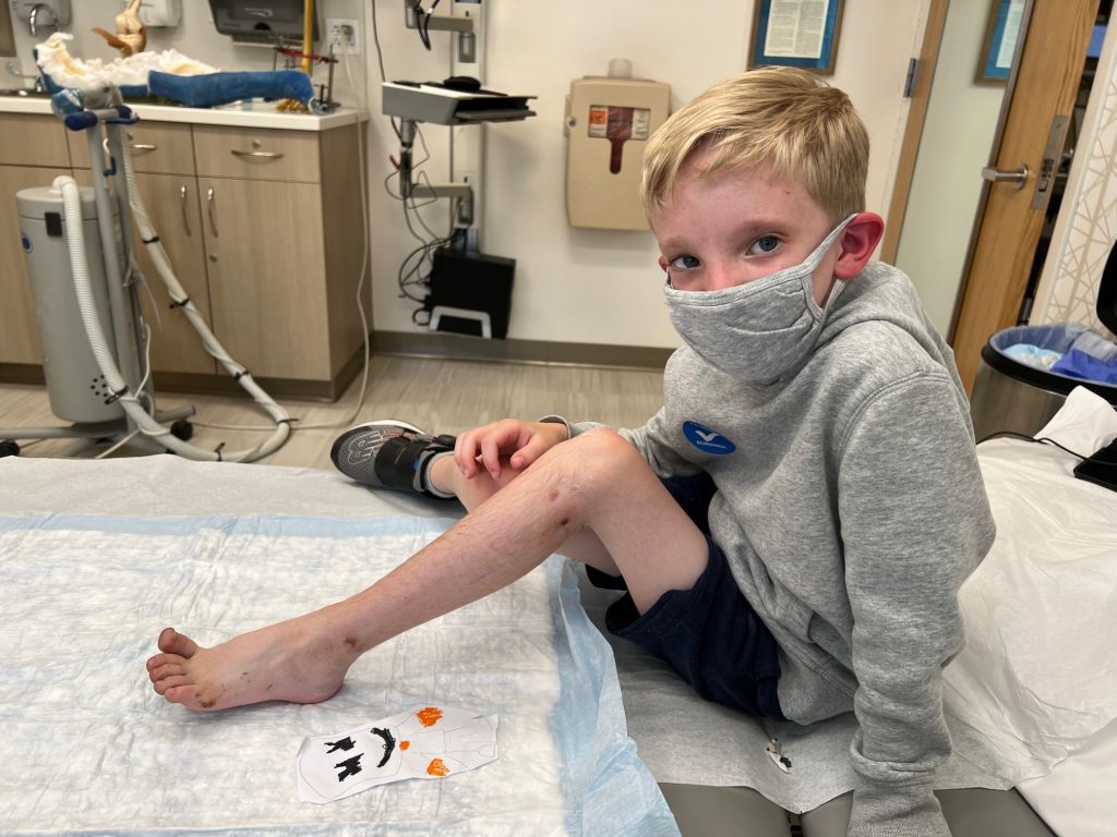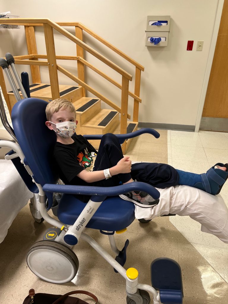 I was able to stay with Reid in the post-op unit as the anesthesia wore off. That time in the post-op unit was definitely the hardest on Mom; I had to be there when he woke up and saw that he had metal hardware attached to the bottom part of his leg, but on the flip side, I was also there when my son needed me to rationalize what he was seeing and experiencing. It was such a mix of emotions and a moment I wasn’t sure I could get through. Fortunately, the post-op nurse was top notch and nursed us both during that hour when our world changed.