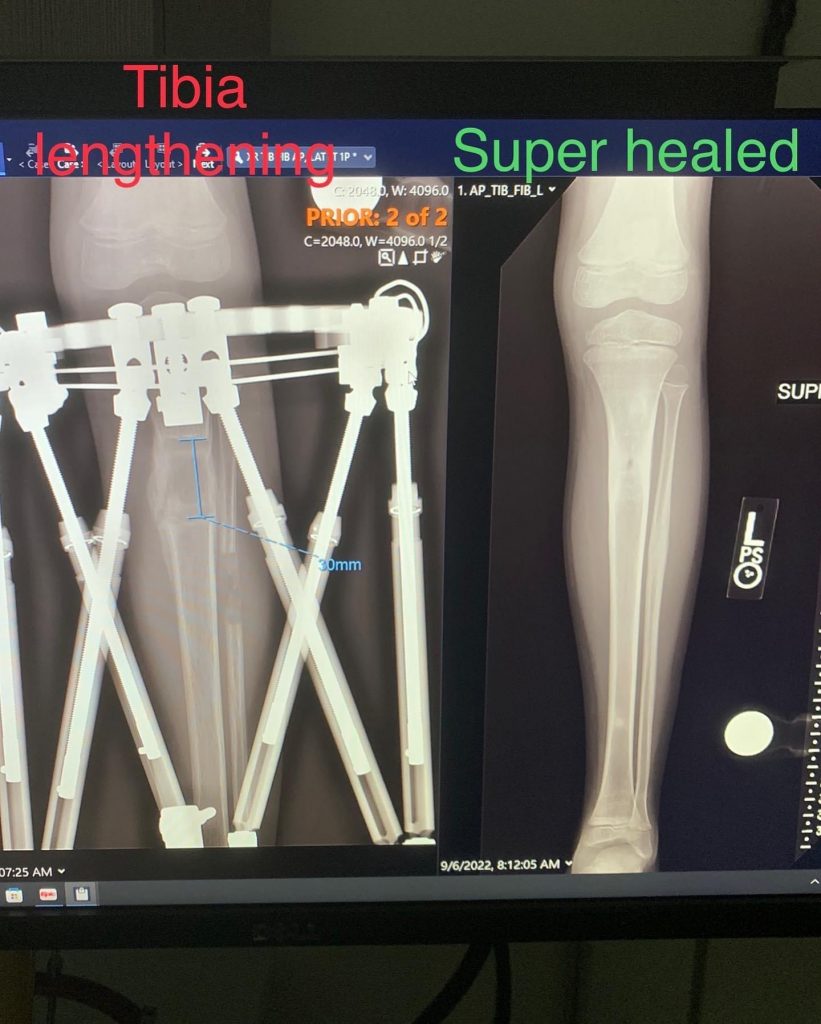 Legs can be lengthened one of two ways – by inserting a rod into the bone and using magnets to lengthen the leg or by attaching an external fixator to the outside of the leg and turning the struts (or screws if you will) to lengthen the leg. The surgery Reid experienced was the attachment of an external fixator. Dr. Rozbruch and his operating team first break the leg bone being lengthened (in Reid’s case, his tibia) and then attach the external fixator using a combination of screws and pins. The pin sites (where the pins meet the skin) must be kept clean and infection-free. The struts (or screws) are turned ever so slightly a few times a day for a handful of weeks (called the Lengthening period). The broken leg bone begins to heal during this period, but not enough to disturb the lengthening. Once the struts have reached the necessary length, the leg has been successfully lengthened and the bone accelerates its healing process now that it is stable and no longer being stretched apart vertically.