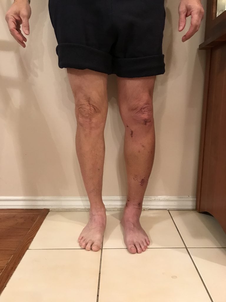 At the time of my injury, I was 15 years old and a goaltender for my high school soccer team. I charged out to stop the opposing forward on a breakaway. I deflected the ball away from his foot, and instead of kicking the ball, he kicks my lower leg, breaking both bones. I underwent surgery the next morning to set my leg. When I woke up, everyone noticed that the cast is a bit bowed, but the doctors advised that it is because I am bowlegged, and my leg will emerge in great shape. That did not happen. Being young, I slogged through the sports I loved, even though my leg was obviously crooked. One of the big disappointments was my inability to ice skate or ski from that time on (could not get an edge).