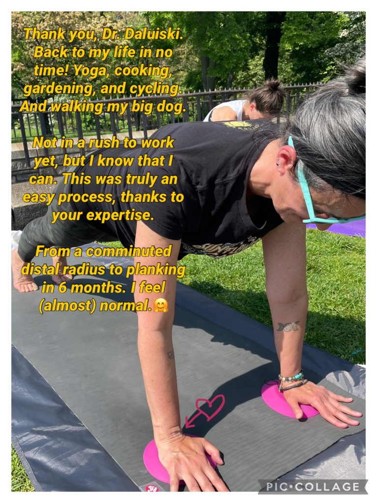 In September 2022, I shattered my wrist when I lost my balance while cleaning my baseboards- just a freak accident. I was lucky enough to get an appointment with Dr. Daluiski a few days later and surgery right away. I’m not an athlete, but am a very active 55 year old woman. The only thing that mattered to me was getting back to my life, my yoga practice and walking my 50lb dog. I have only great things to say about every aspect of my care by Dr. Daluiski and HSS. I had surgery requiring 2 plates, 6 screws and a bone graft. I can honestly say it was relatively painless. I felt so much better within a few days. I was back to my life and a modified yoga practice within three months. And right on cue, when he said the plates would start bothering me, they did. So we scheduled removal of the hardware around the 6 month mark. I was able to clip my fingernails, manage using scissors and get back to cooking for my family within days. By 8 months, I was back to a full yoga practice. And now, 10 months later, I have very few physical reminders of the injury or the two surgeries. Just 2 beautiful scars to remind me to be more careful.