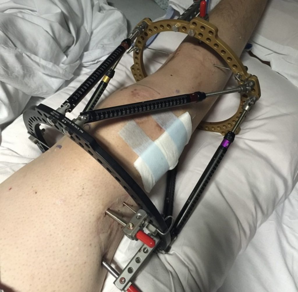 I was not pleased with this outcome at all and immediately began seeking a second opinion. With the help of my father, we scoured the country for orthopedic surgeons who were up to the task of fixing my knee. After speaking with several who turned me away, we finally found Dr. Rozbruch at HSS and I will be forever grateful that we did. From our first meeting, I knew that Dr. Rozbruch would be the doctor that could help me walk again. He is very personable and friendly and leaves you with the impression that you are more than just another case for him to diagnose and manage. He answered all my questions, questions that my doctors in South Carolina were unable to answer. He gave me hope during what had been the worst year of my life. After agreeing to work on my knee, I ended up having four more knee surgeries with Dr. Rozbruch at HSS. That’s eight total surgeries if you’ve been keeping track! One of the surgeries involved the use of an Ilizarov frame. It consisted of two rings around my leg/knee each connected by pistons that could be adjusted using a special tool.