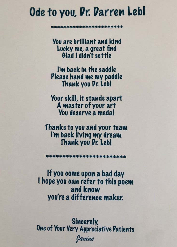 I am a physical education teacher and coach. I also love spending time being active out in nature. I’m not used to not being active and feeling strong. Feeling broken is a terrible feeling. Dr. Lebl and his level of expertise has put me back on the path to being active me again. He is truly a difference maker in my life, and I am eternally grateful. I wrote a poem that sums up my experience with Dr. Darren Lebl and his team at HSS.