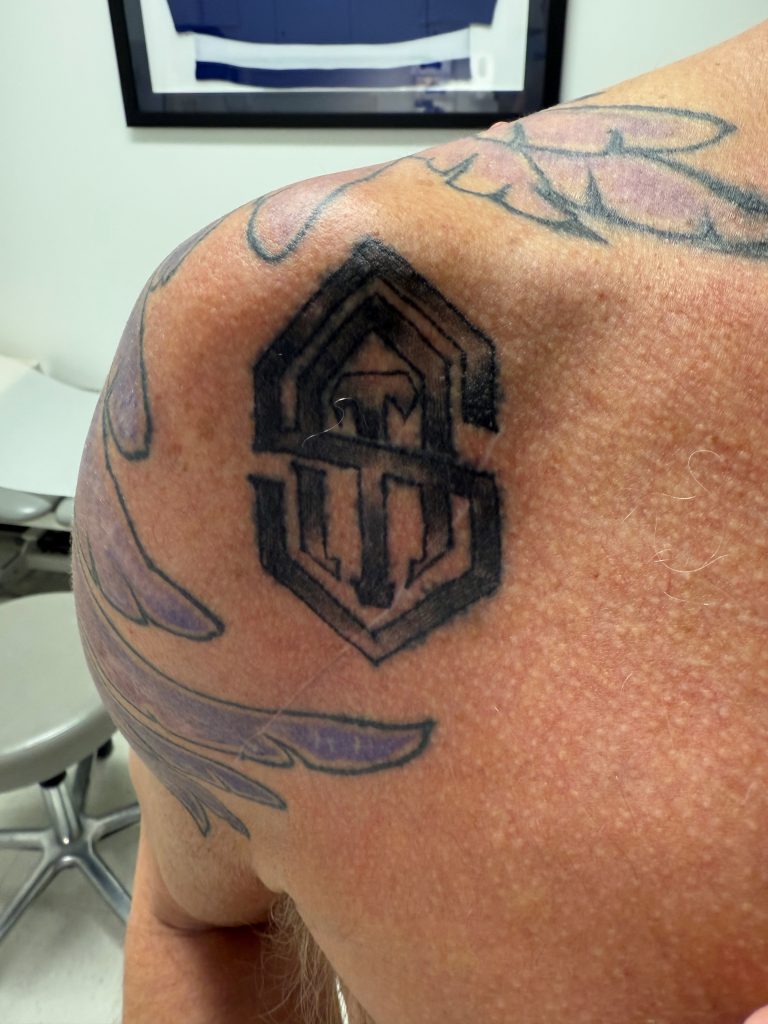 During a recent patient evaluation, I unveiled a personalized gift for Dr. Taylor: a tattoo which I designed and had an artist apply to my repaired shoulder featuring a monogram of the surgeon’s initials.