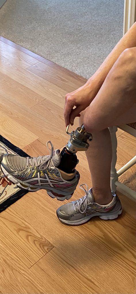 After 20 years of sitting on a tub bench to shower, I now STAND in the shower! My prosthetist was able to take one of my old feet and adapt it as my shower leg that I simply screw on. It doesn’t have a foot shell or sock to get wet, it’s just metal.