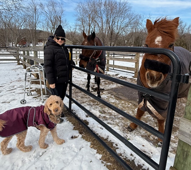 My husband and I own a small horse property, with our barn just behind our house. We have four adopted horses, an adopted dog, and two adopted cats. Caring for them is a large part of my daily life.