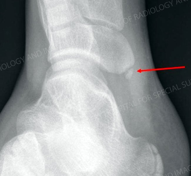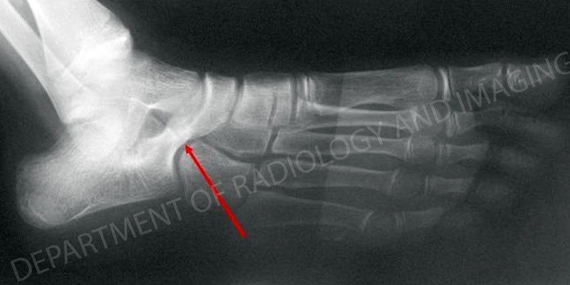 Right foot with calcaneonavicular coalition. The red arrow indicates the coalition.